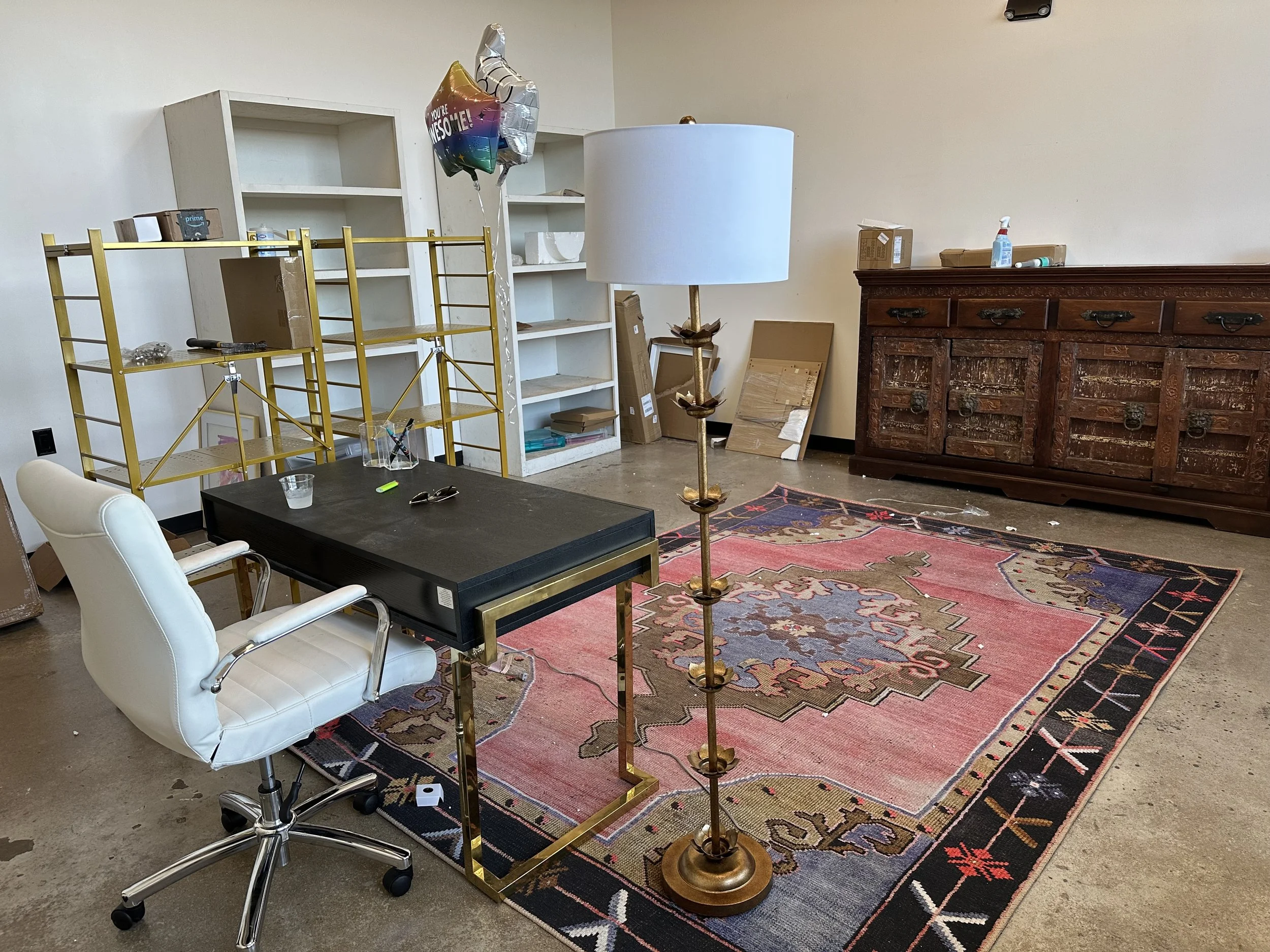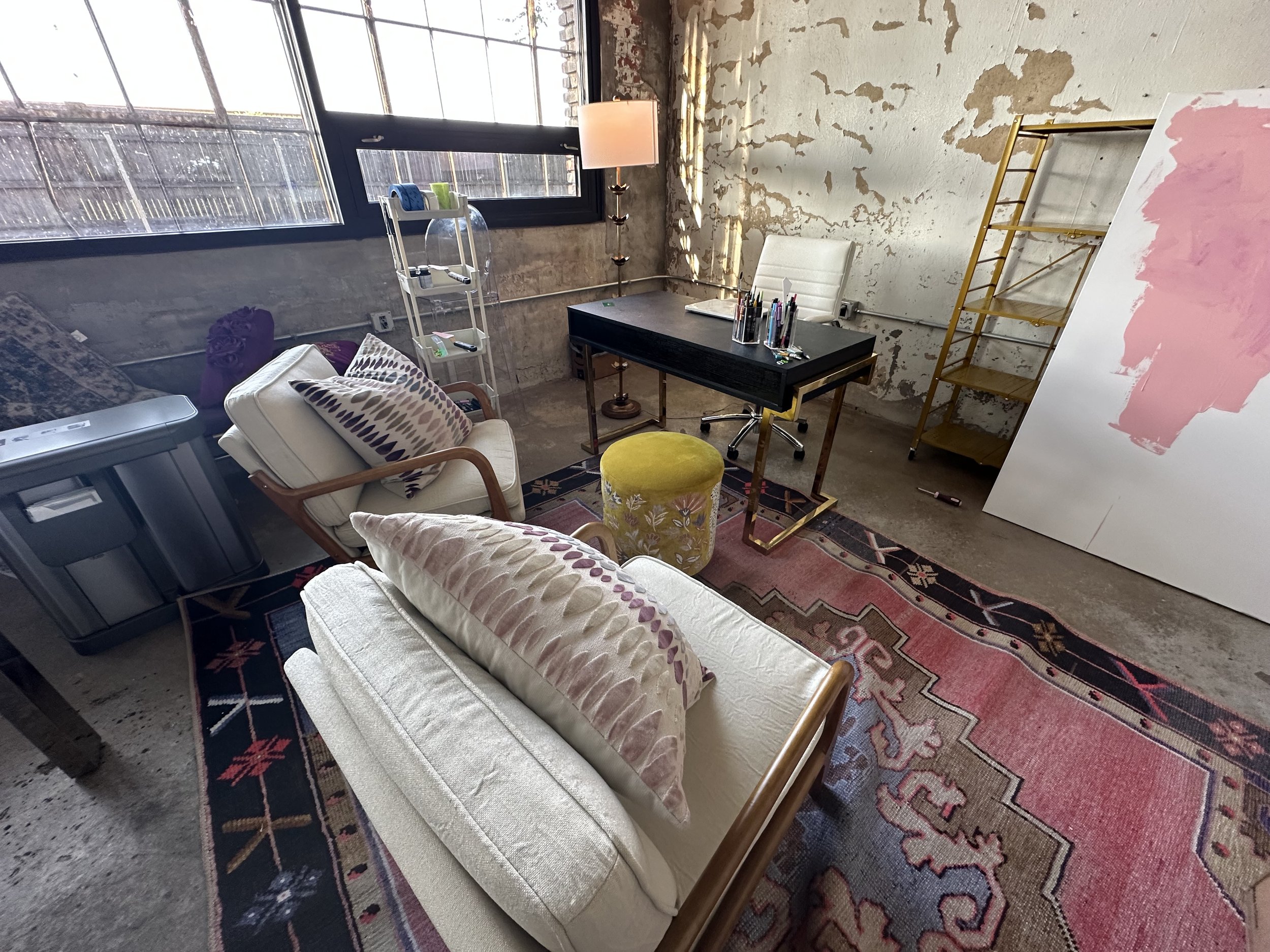 The first thing I noticed when I walked into this studio, I was intimidated by the size and the concrete floors, but I knew with the right layout it could be my dream studio. I embraced the exposed ceilings and open feel, and began layering warmth through furniture, rugs, and lighting.