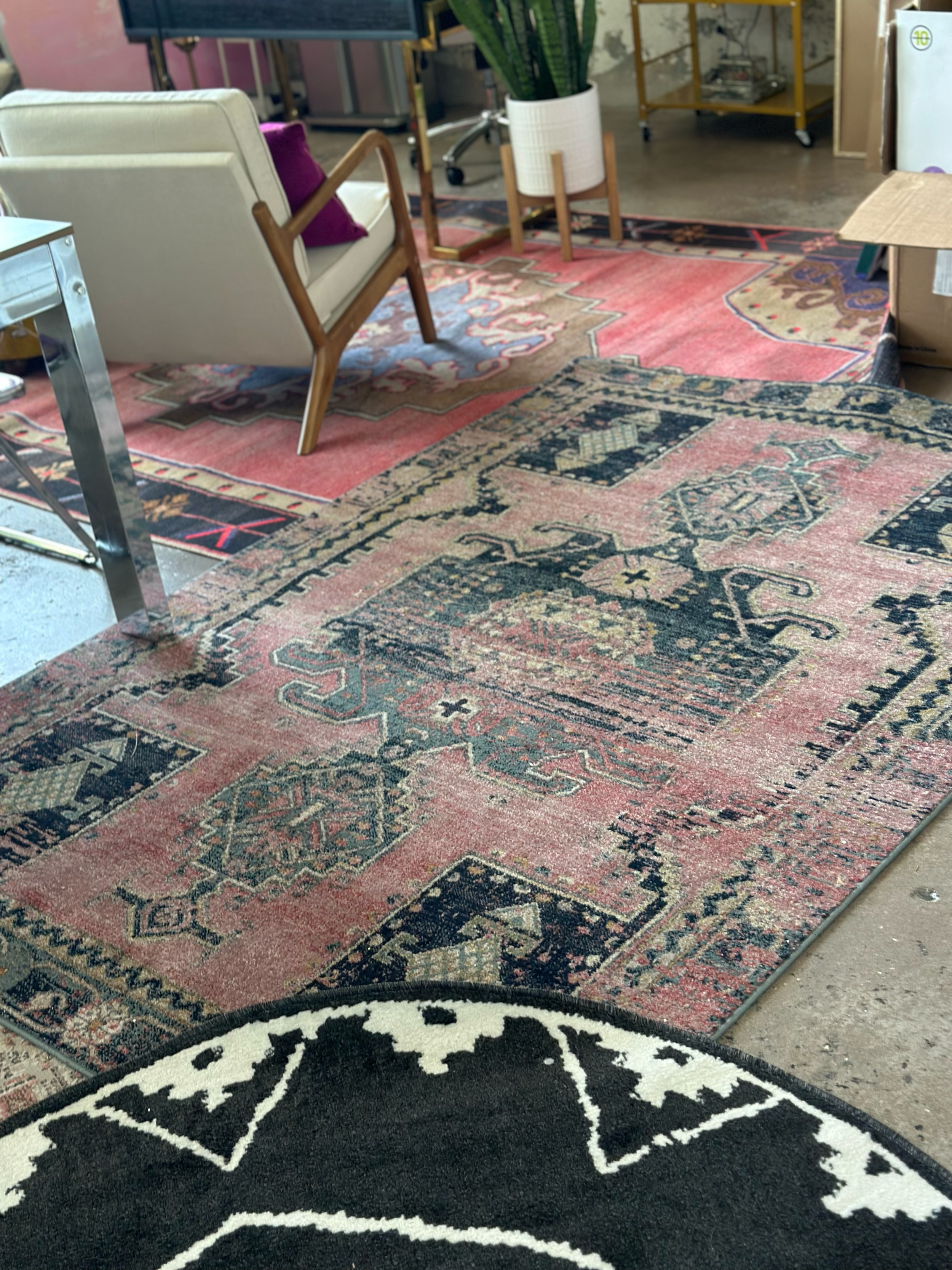 Concrete floors can feel cold and unwelcoming, but rugs instantly add warmth, dimension, and personality. I have always had a thing for rugs so I was very excited to see how the rugs I chose would go together. I started with a large rug I loved and layered smaller, geometric patterned rugs with similar colors for depth and visual interest.